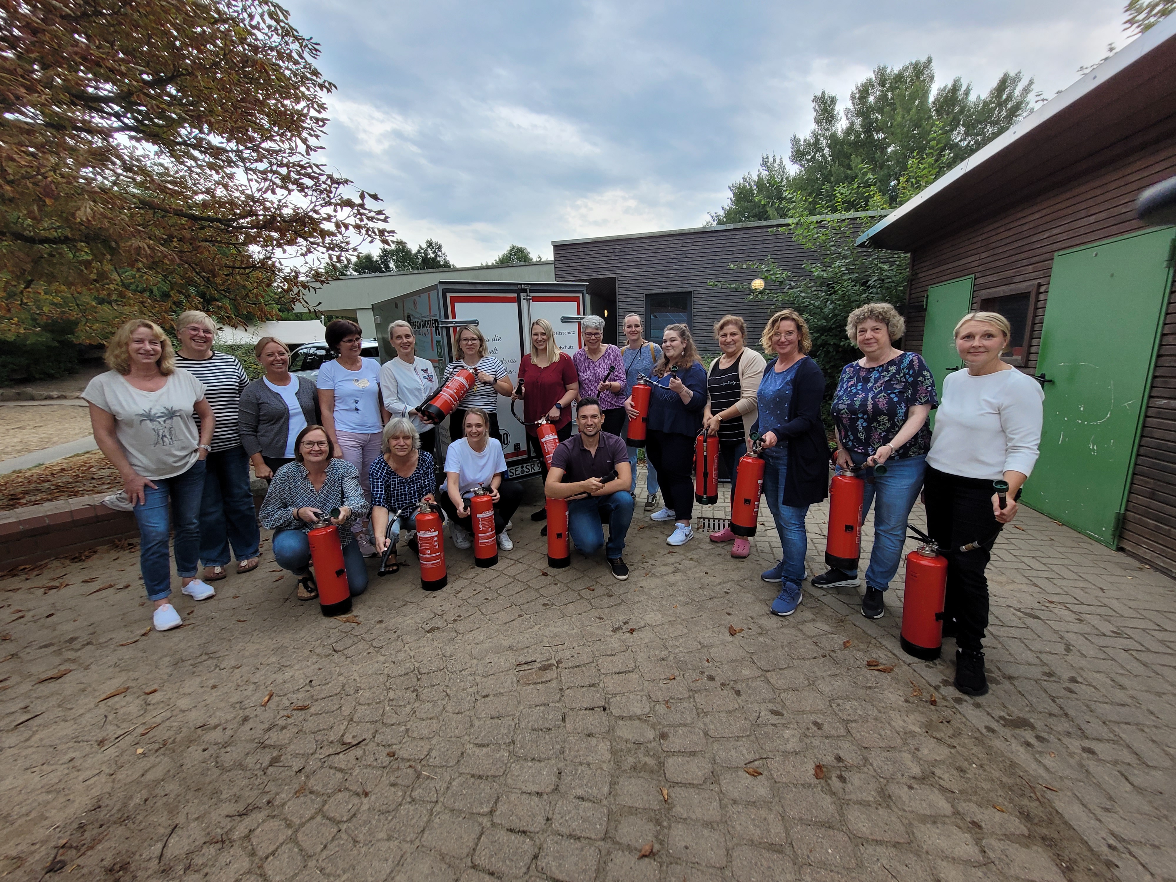 Anschließend folgte ein praktischer Abschnitt, in dem die Erzieherinnen die Gelegenheit hatten, den korrekten Einsatz von Feuerlöschern selbst auszuprobieren. Dabei wurde eine realistische Brandsituation simuliert, bei der das Team das geübte Wissen direkt anwenden konnte.